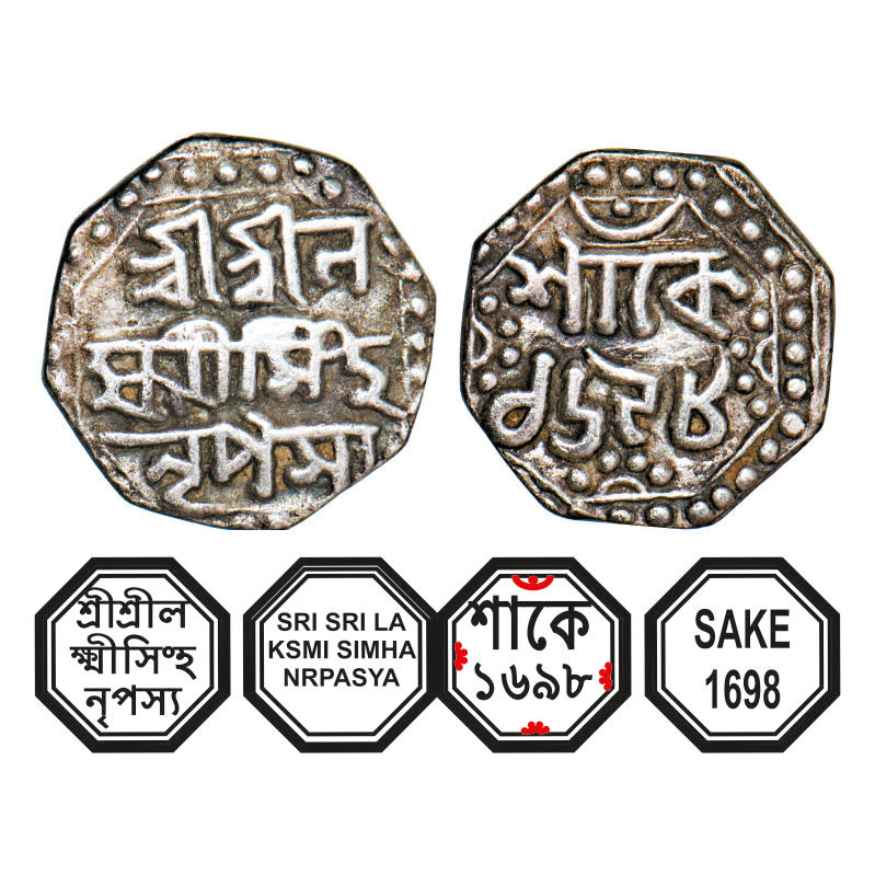 | Assam, Octagonal Silver Quarter Rupee, 2.76g, Lakshmi Simha (1770-80), Sk. 1698, Assamese legends in three lines, Obv: Sri Sri La/ksmi Simha/ Nrpasya, (line over Ha), Rev: in two lines, Sake/ 1698, with dot in crescent on top. Reverse die perfectly struck at 6 o'clock. (A.Mitra. 311, RB. Q 53.1). Extremely Fine, Scarce. |