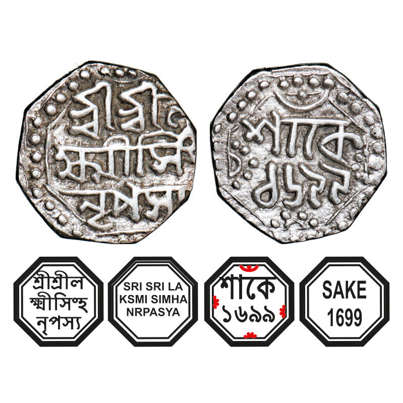 | Assam, Octagonal Silver Quarter Rupee, 2.84g, Lakshmi Simha (1770-80), Sk. 1699, Assamese legends in three lines, Obv: Sri Sri La/ksmi Simha/ Nrpasya, Rev: in two lines, Sake/ 1699, with dot in crescent on top. Reverse die perfectly struck at 6 o'clock. (A.Mitra. 312, RB. Q 54.1). Extremely Fine, Scarce. |