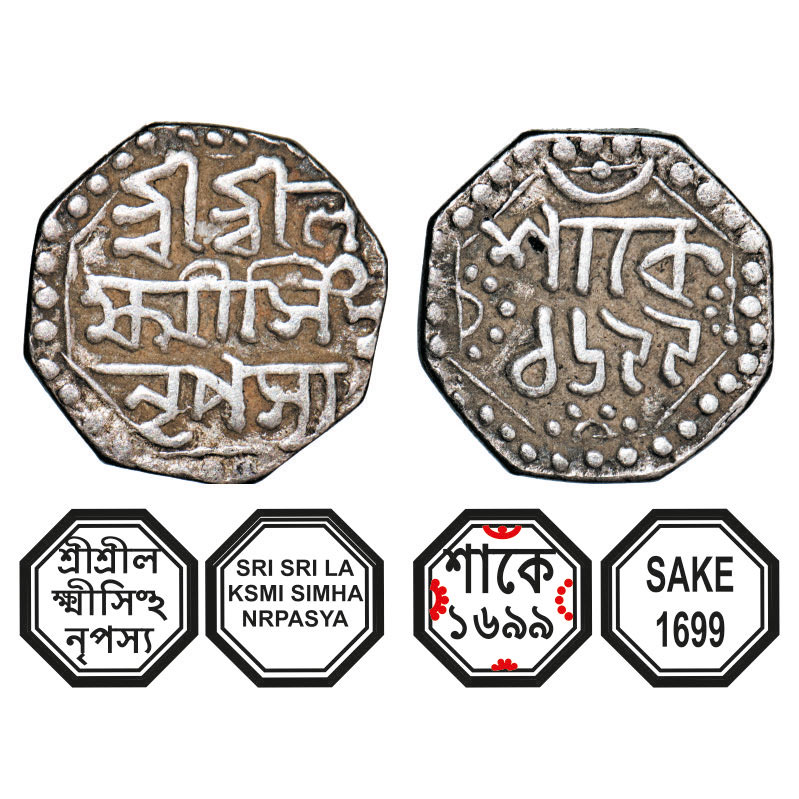 | Assam, Octagonal Silver Quarter Rupee, 2.84g, Lakshmi Simha (1770-80), Sk. 1699, Assamese legends in three lines, Obv: Sri Sri La/ksmi Simha/ Nrpasya, (no line over Ha), Rev: in two lines, Sake/ 1699, with dot in crescent on top. Reverse die perfectly struck at 6 o'clock. (A.Mitra. 312A, RB. Q 54.1 type). Extremely Fine, Scarce. |