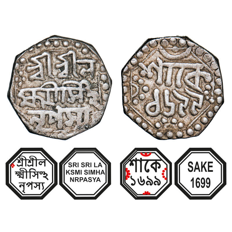 | Assam, Octagonal Silver Quarter Rupee, 2.84g, Lakshmi Simha (1770-80), Sk. 1699, Assamese legends in three lines, Obv: Sri Sri La/ksmi Simha/ Nrpasya, (no line over Ha), Rev: in two lines, Sake/ 1699, with dot in crescent on top. Reverse die perfectly struck at 6 o'clock. (A.Mitra. 312B, RB. Q 54.1 unlisted type). Very Fine, Scarce. |