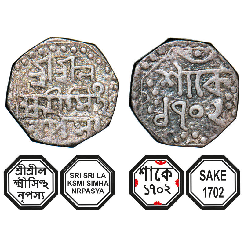 | Assam, Octagonal Silver Quarter Rupee, 2.77g, Lakshmi Simha (1770-80), Sk. 1702, Assamese legends in three lines, Obv: Sri Sri La/ksmi Simha/ Nrpasya, (no line over Ha), Rev: in two lines, Sake/ 1702, with dot in crescent on top. Reverse die perfectly struck at 6 o'clock. (A.Mitra. 315A, RB. Q 57.1 type). Very Fine, Scarce. |