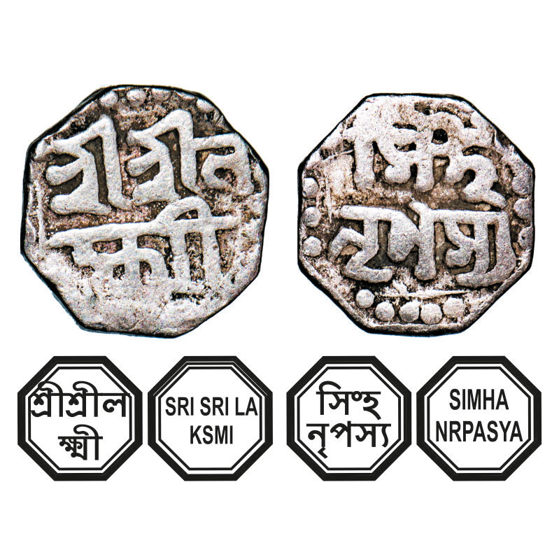 | Assam, Octagonal Silver 1/8 Rupee, 1.37g, Lakshmi Simha (1770-80), undated, Assamese legends in two lines, crude type, Obv: Sri Sri La/ksmi, Rev: Simha/ Nrpasya. Reverse die perfectly struck at 6 o'clock. (A.Mitra. 316, RB. Q 59.1). Very Fine, Scarce. |