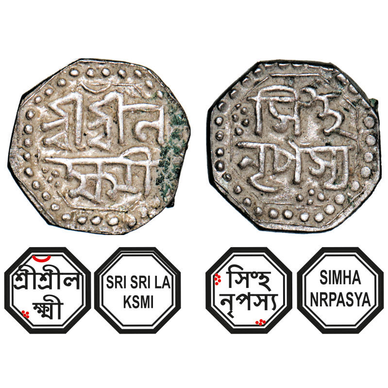 | Assam, Octagonal Silver 1/8 Rupee, 1.42g, Lakshmi Simha (1770-80), undated, Assamese legends in two lines, fine type, Obv: Sri Sri La/ksmi, crescent above, Rev: Simha/ Nrpasya. Reverse die perfectly struck at 6 o'clock. (A.Mitra. 316B, RB. Q 59.3). Extremely Fine, Scarce. |
