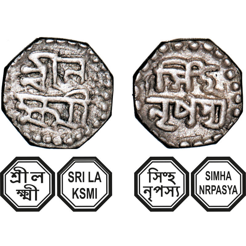 | Assam, Octagonal Silver 1/16 Rupee, 0.71g, Lakshmi Simha (1770-80), undated, Assamese legends in two lines, fine type, Obv: Sri La/ksmi, Rev: Simha/ Nrpasya. Reverse die perfectly struck at 6 o'clock. (A.Mitra. 318A, RB. Q 60.1 type). Extremely Fine+, Scarce. |
