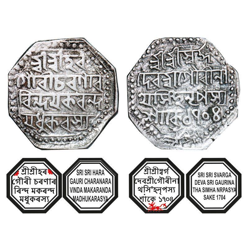 | Assam, Octagonal Silver Rupee, 11.36g, Gaurinatha Simha (1780-95), Assamese legends in four lines, Sk. 1704, with invocation to Siva & Parvati, Obv: Sri Sri Hara/ Gauri Charanara/vinda Makaranda/ Madhukarasya, Rev: Sri Sri Svarga/ Deva Sri Gaurina/tha Simha Nrpasya / Sake 1704, Winged lion at bottom running left. Reverse die perfectly struck at 6 o'clock. (A.Mitra. 348, RB. R 33.2). Very Fine, Scarce. |