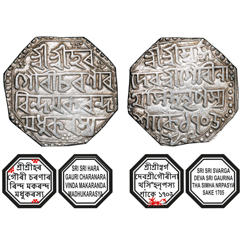 | Assam, Octagonal Silver Rupee, 11.32g, Gaurinatha Simha (1780-95), Assamese legends in four lines, Sk. 1705, with invocation to Siva & Parvati, Obv: Sri Sri Hara/ Gauri Charanara/vinda Makaranda/ Madhukarasya, Rev: Sri Sri Svarga/ Deva Sri Gaurina/tha Simha Nrpasya / Sake 1705, Winged lion at bottom running left. Reverse die perfectly struck at 6 o'clock. (A.Mitra. 349, RB. R 34.4). Very Fine, Scarce. |