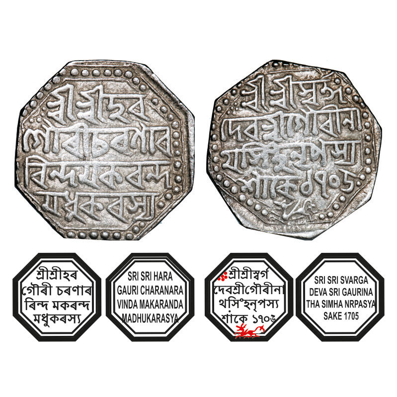 | Assam, Octagonal Silver Rupee, 11.39g, Gaurinatha Simha (1780-95), Assamese legends in four lines, Sk. 1705, with invocation to Siva & Parvati, Obv: Sri Sri Hara/ Gauri Charanara/vinda Makaranda/ Madhukarasya, Rev: Sri Sri Svarga/ Deva Sri Gaurina/tha Simha Nrpasya / Sake 1705, Winged lion at bottom running left. Reverse die perfectly struck at 6 o'clock. (A.Mitra. 349, RB. R 34 unlisted type). Broad flan, Very Fine, Scarce. |