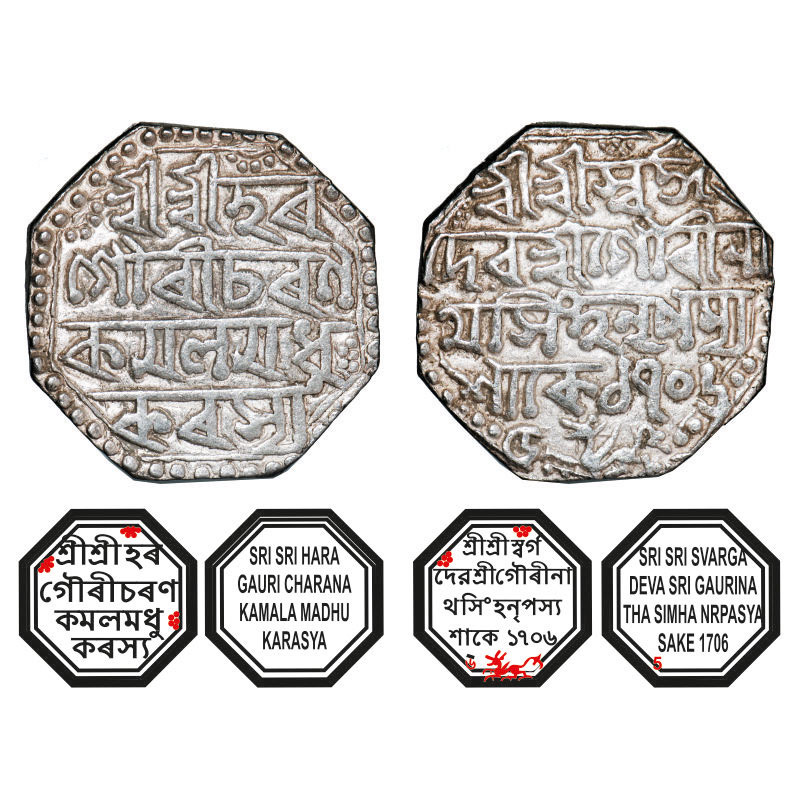 | Assam, Octagonal Silver Rupee, 11.37g, Gaurinatha Simha (1780-95), Assamese legends in four lines, Sk. 1706 year 5, with invocation to Siva & Parvati, Obv: Sri Sri Hara/ Gauri Charana/ Kamala Madhu/karasya, Rev: Sri Sri Svarga/ Deva Sri Gaurina/tha Simha Nrpasya / Sake 1706/5, Winged lion at bottom running left. Reverse die perfectly struck at 6 o'clock. (A.Mitra. 352, RB. R 36.3). Very Fine, Scarce. |