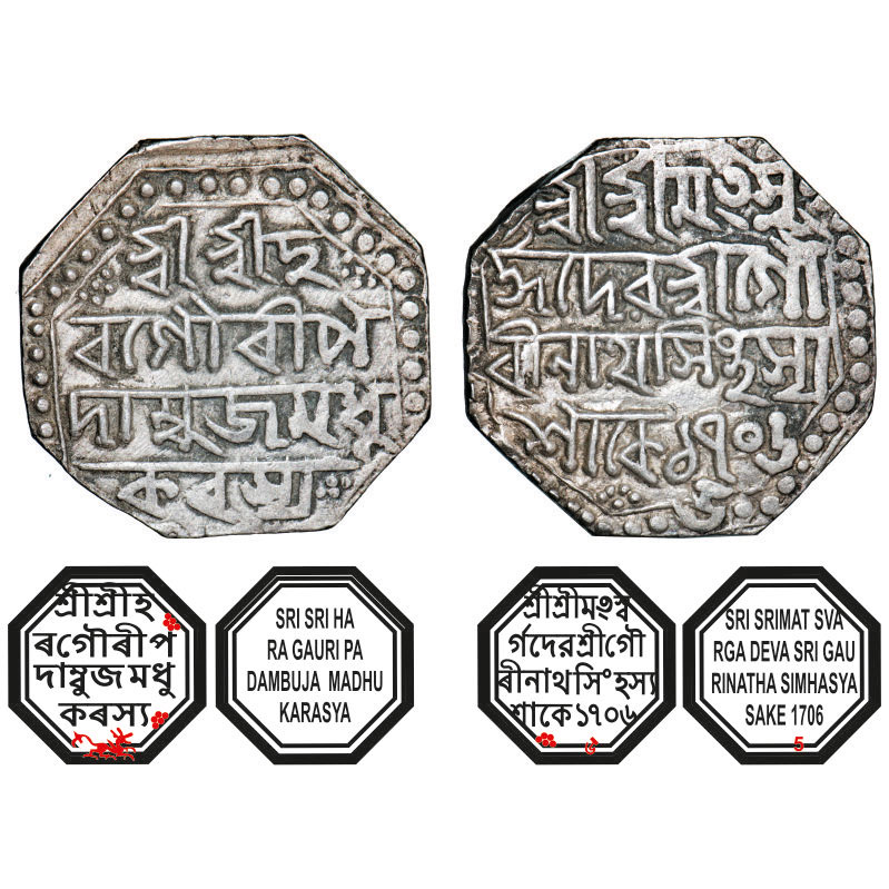 | Assam, Octagonal Silver Rupee, 11.33g, Gaurinatha Simha (1780-95), Assamese legends in four lines, Sk. 1706 year 5, with invocation to Siva & Parvati, Obv: Sri Sri Ha/ra Gauri Pa/dambuja Madhu/karasya, (Winged lion bottom running right), Rev: Sri Srimat Sva/rga Deva Sri Gau/rinatha Simhasya / Sake 1706/5. Reverse die perfectly struck at 6 o'clock. (A.Mitra. 351A, RB. R 38.3). Very Fine, Scarce. |
