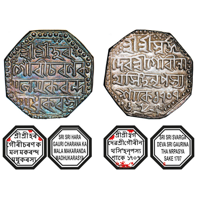 | Assam, Octagonal Silver Rupee, 11.33g, Gaurinatha Simha (1780-95), Assamese legends in four lines, Sk. 1707 year 6, with invocation to Siva & Parvati, Obv: Sri Sri Hara/ Gauri Charana Ka/mala Makaranda/ Madhukarasya, Rev: Sri Sri Svarga/ Deva Sri Gaurina/tha Simha Nrpasya / Sake 1707/6, Winged lion at bottom running left. Reverse die perfectly struck at 6 o'clock. (A.Mitra. 354, RB. R 39.2). Almost toned Uncirculated, Scarce. |