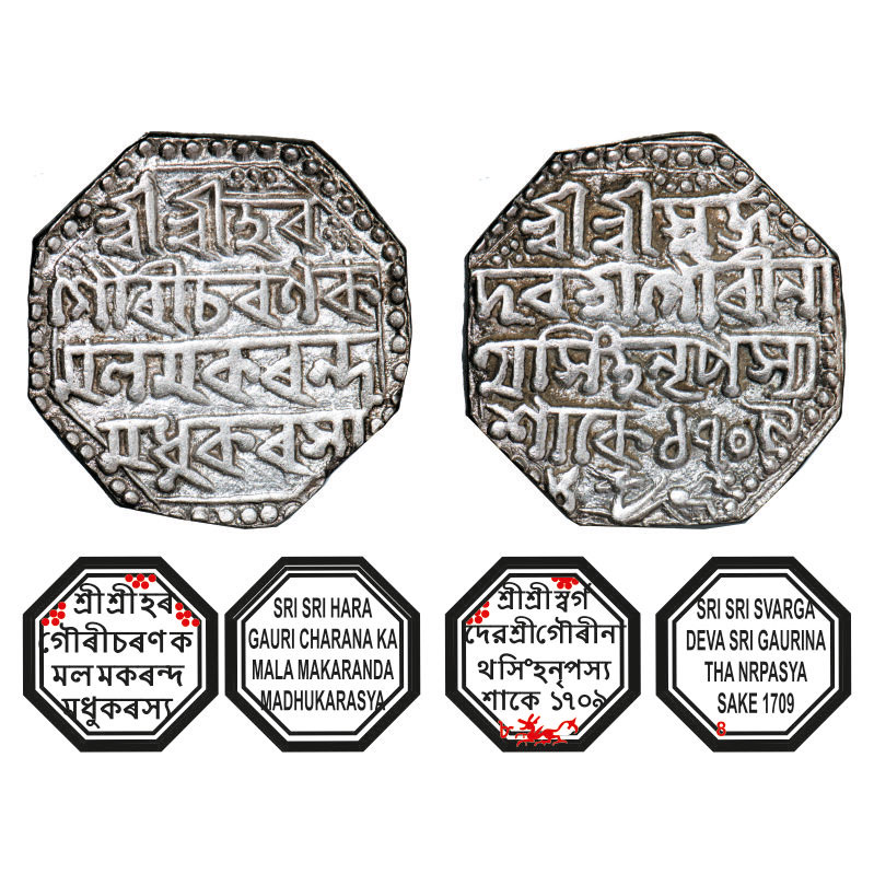 | Assam, Octagonal Silver Rupee, 11.31g, Gaurinatha Simha (1780-95), Assamese legends in four lines, Sk. 1709 year 8, with invocation to Siva & Parvati, Obv: Sri Sri Hara/ Gauri Charana Ka/mala Makaranda/ Madhukarasya, Rev: Sri Sri Svarga/ Deva Sri Gaurina/tha Simha Nrpasya / Sake 1709/8, Winged lion at bottom running left. Reverse die perfectly struck at 6 o'clock. (A.Mitra. 356, RB. R 41.1). Very Fine, Scarce. |