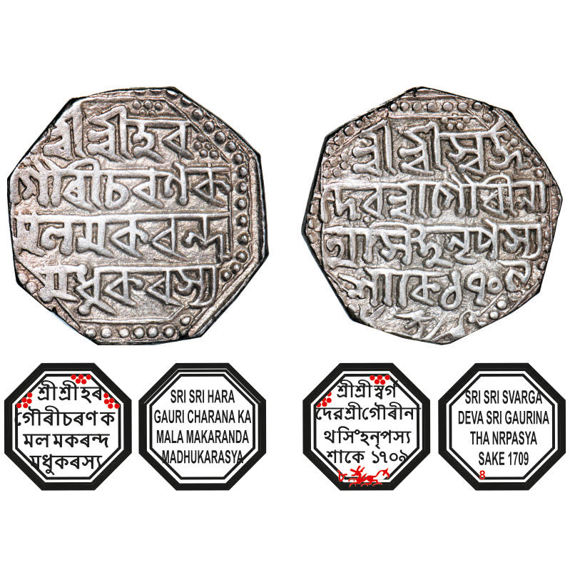 | Assam, Octagonal Silver Rupee, 11.35g, Gaurinatha Simha (1780-95), Assamese legends in four lines, Sk. 1709 year 8, with invocation to Siva & Parvati, Obv: Sri Sri Hara/ Gauri Charana Ka/mala Makaranda/ Madhukarasya, Rev: Sri Sri Svarga/ Deva Sri Gaurina/tha Simha Nrpasya / Sake 1709/8, Winged lion at bottom running left. Reverse die perfectly struck at 6 o'clock. (A.Mitra. 356A, RB. R 41.2). Very Fine, Scarce. |