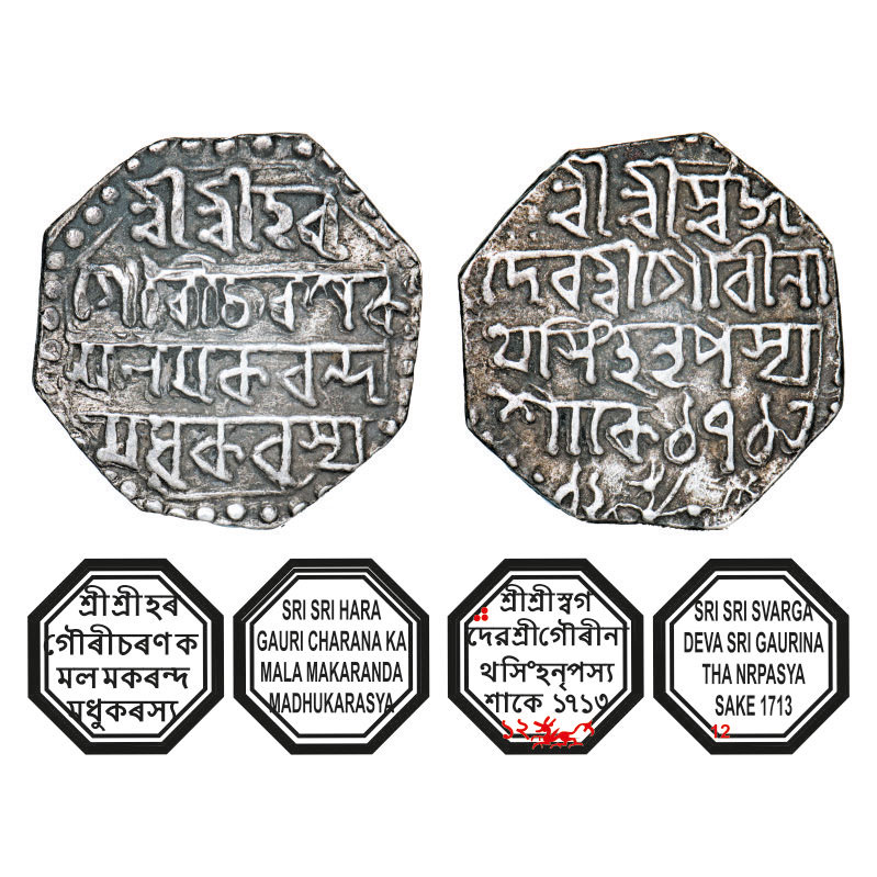 | Assam, Octagonal Silver Rupee, 11.14g, Gaurinatha Simha (1780-95), Assamese legends in four lines, Sk. 1713 year 12, with invocation to Siva & Parvati, Obv: Sri Sri Hara/ Gauri Charana Ka/mala Makaranda/ Madhukarasya, Rev: Sri Sri Svarga/ Deva Sri Gaurina/tha Simha Nrpasya / Sake 1713/12, Winged lion at bottom running left. wornout mule die struck. All coins dated Sk. 1710 to 1715 are either rare or very rare. During this period Gaurinatha had either fled from Rangpur, his former capital, to Guwahati, or was on his way back with the sepoys sent by the British, who were to help him regain it from the rebels. Reverse die perfectly struck at 6 o'clock. (A.Mitra. 362, RB. R 47 unlisted type).