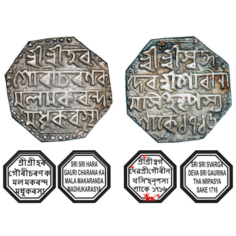 | Assam, Octagonal Silver Rupee, 11.38g, Gaurinatha Simha (1780-95), Assamese legends in four lines, Sk. 1716, with invocation to Siva & Parvati, Obv: Sri Sri Hara/ Gauri Charana Ka/mala Makaranda/ Madhukarasya, Rev: Sri Sri Svarga/ Deva Sri Gaurina/tha Simha Nrpasya / Sake 1716, Winged lion at bottom running left. Reverse die perfectly struck at 6 o'clock. (A.Mitra. 366A, RB. R 51 type unlisted). Very Fine, Scarce. |