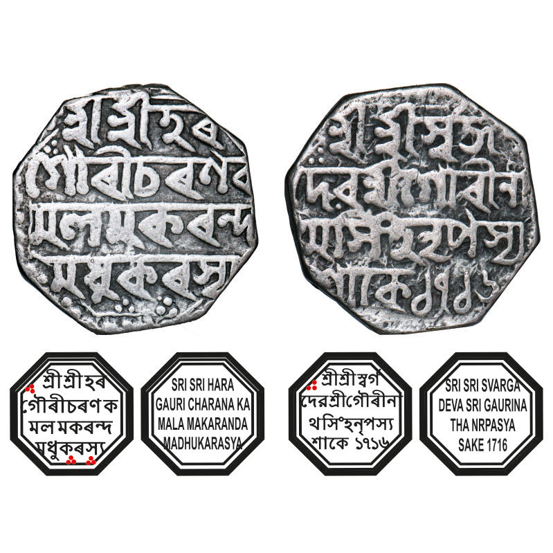 | Assam, Octagonal Silver Rupee, 11.22g, Gaurinatha Simha (1780-95), Assamese legends in four lines, Sk. 1716, with invocation to Siva & Parvati, Obv: Sri Sri Hara/ Gauri Charana Ka/mala Makaranda/ Madhukarasya, Rev: Sri Sri Svarga/ Deva Sri Gaurina/tha Simha Nrpasya / Sake 1716, Winged lion at bottom running left. Reverse die perfectly struck at 6 o'clock. (A.Mitra. 366D, RB. R 52 unlisted type). About Very Fine, Scarce. |