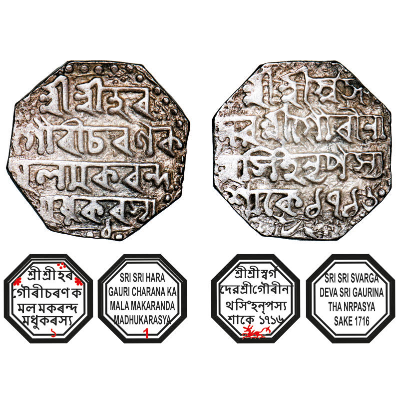 | Assam, Octagonal Silver Rupee, 11.28g, Gaurinatha Simha (1780-95), Assamese legends in four lines, Sk. 1716 year 1, with invocation to Siva & Parvati, Obv: Sri Sri Hara/ Gauri Charana Ka/mala Makaranda/ Madhukarasya, (year) 1 below, Rev: Sri Sri Svarga/ Deva Sri Gaurina/tha Simha Nrpasya / Sake 1716, Winged lion at bottom running left. Reverse die perfectly struck at 6 o'clock. (A.Mitra. 368, RB. R 55.3 unlisted type). About Very Fine, Scarce. |