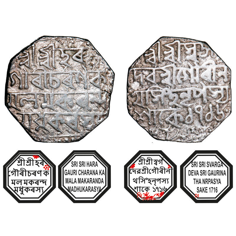 | Assam, Octagonal Silver Rupee, 11.27g, Gaurinatha Simha (1780-95), Assamese legends in four lines, Sk. 1716, with invocation to Siva & Parvati, Obv: Sri Sri Hara/ Gauri Charana Ka/mala Makaranda/ Madhukarasya, Rev: Sri Sri Svarga/ Deva Sri Gaurina/tha Simha Nrpasya / Sake 1716, with 'Di' (Dichoi Mint) at bottom to left of Winged lion at bottom running left. Reverse die perfectly struck at 6 o'clock. (A.Mitra. 367, RB. R 58 unlisted type). About Very Fine, Scarce. |