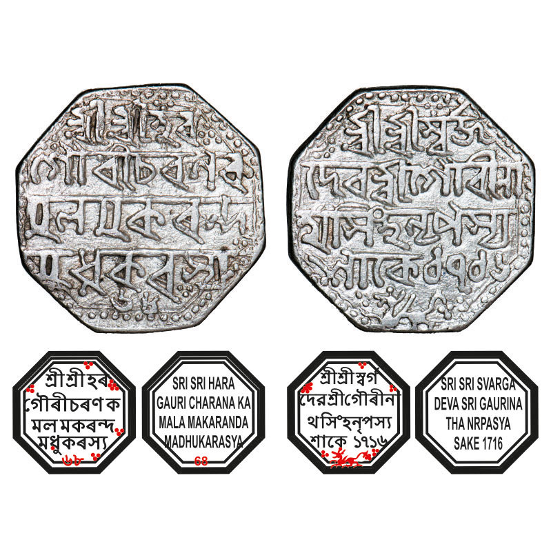 | Assam, Octagonal Silver Rupee, 11.48g, Gaurinatha Simha (1780-95), Assamese legends in four lines, Sk. 1716 year 68, with invocation to Siva & Parvati, Obv: Sri Sri Hara/ Gauri Charana Ka/mala Makaranda/ Madhukarasya, (year) 68 below, Rev: Sri Sri Svarga/ Deva Sri Gaurina/tha Simha Nrpasya / Sake 1716, Winged lion at bottom running left. Reverse die perfectly struck at 6 o'clock. Ex Nichloas Rhodes collection (Ex K Wiggins) collection with pedigree tag. (A.Mitra. 371, RB. R 59.1 type). Broad flan, Very Fine, Very Rare. |