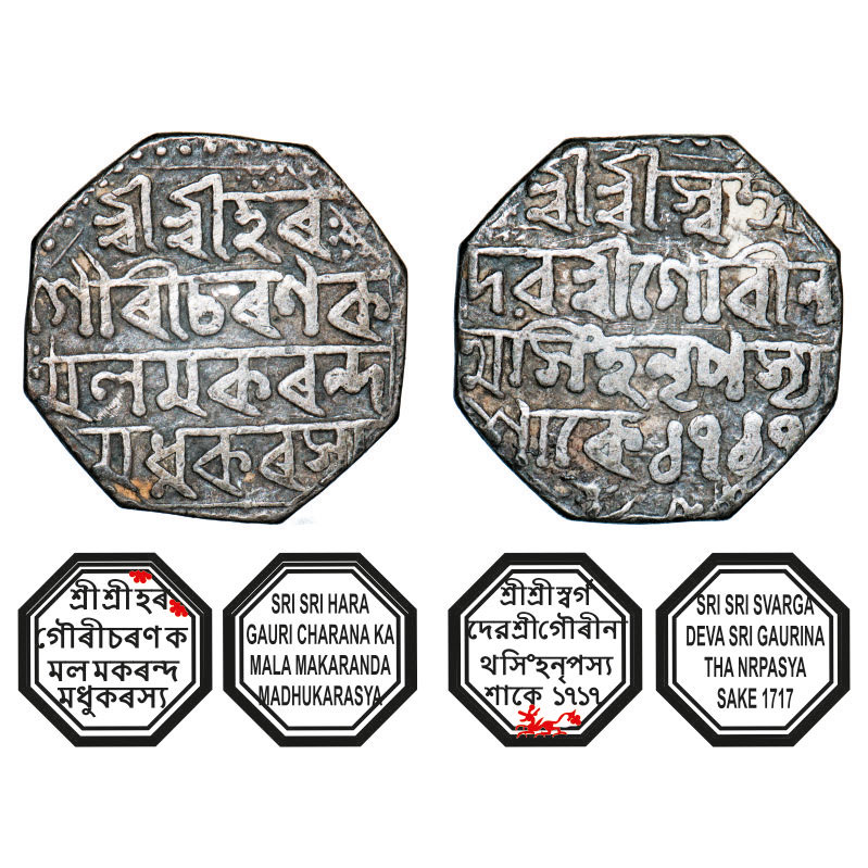 | Assam, Octagonal Silver Rupee, 11.20g, Gaurinatha Simha (1780-95), Assamese legends in four lines, Sk. 1717, with invocation to Siva & Parvati, Obv: Sri Sri Hara/ Gauri Charana Ka/mala Makaranda/ Madhukarasya, Rev: Sri Sri Svarga/ Deva Sri Gaurina/tha Simha Nrpasya / Sake 1717, Winged lion at bottom running left. Reverse die perfectly struck at 6 o'clock. (A.Mitra. 376A, RB. R 60.3 type). Toned About Very Fine, Scarce. |
