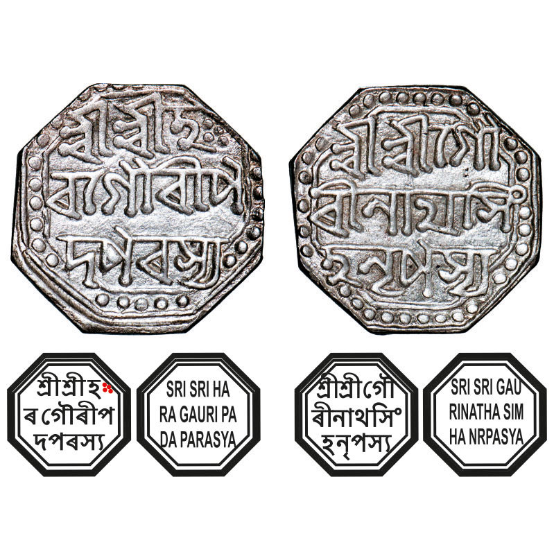 | Assam, Octagonal Silver Half Rupee, 5.73g, Gaurinatha Simha (1780-95), Assamese legends in three lines, undated, with invocation to Siva & Parvati, Obv: Sri Sri Ha/ra Gauri Pa/da Parasya, Rev: Sri Sri Gau/rinatha Sim/ha Nrpasya. Reverse die perfectly struck at 6 o'clock. (A.Mitra. 379 type, RB. R 65.1 type). Toned About Very Fine, Scarce. |