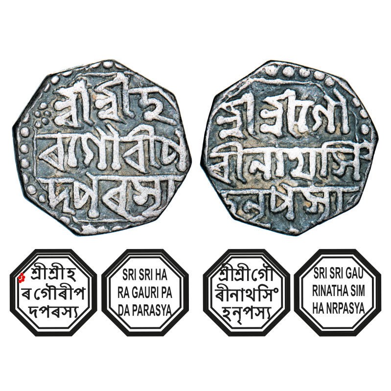 | Assam, Octagonal Silver Half Rupee, 5.53g, Gaurinatha Simha (1780-95), Assamese legends in three lines, undated, with invocation to Siva & Parvati, Obv: Sri Sri Ha/ra Gauri Pa/da Parasya, Rev: Sri Sri Gau/rinatha Sim/ha Nrpasya. Reverse die perfectly struck at 6 o'clock. (A.Mitra. 377, RB. R 65 type unlisted). Toned About Very Fine, Scarce. |