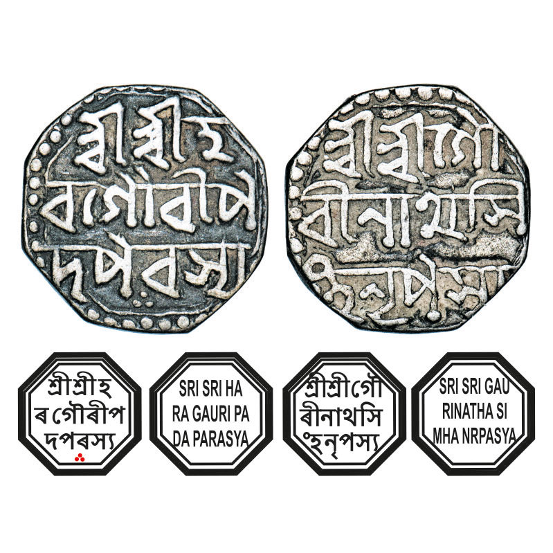 | Assam, Octagonal Silver Half Rupee, 5.64g, Gaurinatha Simha (1780-95), Assamese legends in three lines, undated, with invocation to Siva & Parvati, Obv: Sri Sri Ha/ra Gauri Pa/da Parasya, Rev: Sri Sri Gau/rinatha Si/mha Nrpasya. Reverse die perfectly struck at 6 o'clock. (A.Mitra. 378D, RB. R 67 type unlisted). Toned About Very Fine, Scarce. |