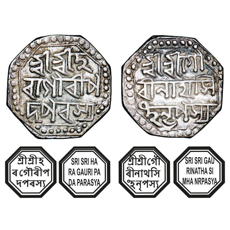 | Assam, Octagonal Silver Half Rupee, 5.60g, Gaurinatha Simha (1780-95), Assamese legends in three lines, undated, with invocation to Siva & Parvati, Obv: Sri Sri Ha/ra Gauri Pa/da Parasya, Rev: Sri Sri Gau/rinatha Si/mha Nrpasya. Reverse die perfectly struck at 6 o'clock. (A.Mitra. 378A, RB. R 67.2 type). Very Fine+, Scarce. |