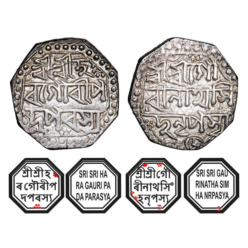 | Assam, Octagonal Silver Half Rupee, 5.65g, Gaurinatha Simha (1780-95), Assamese legends in three lines, year 5, with invocation to Siva & Parvati, Obv: Sri Sri Ha/ra Gauri Pa/da Parasya, Rev: Sri Sri Gau/rinatha Sim/ha Nrpasya & (year) 5 in different form at bottom, crescent on top at reverse. Reverse die perfectly struck at 6 o'clock. (A.Mitra. 382A. RB. R 68.3 type unlisted). Very Fine+, Scarce. |