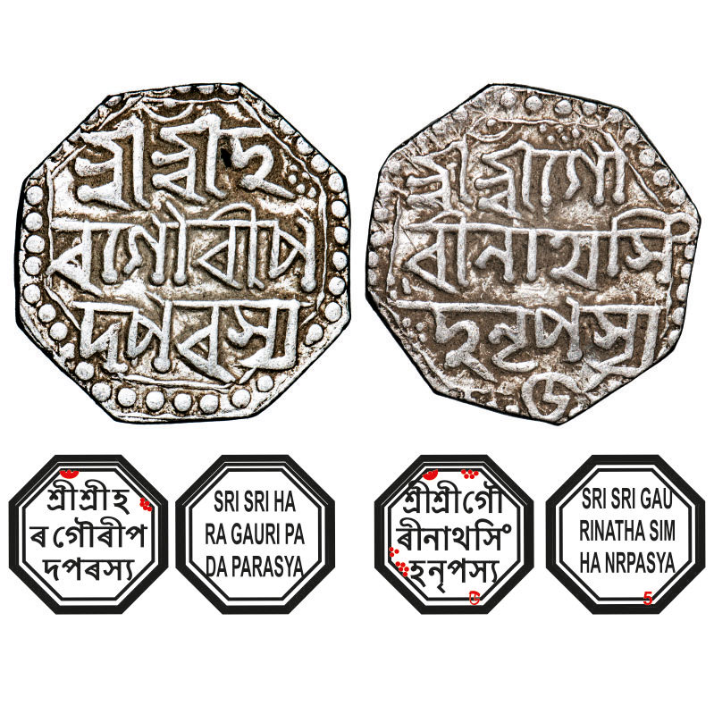 | Assam, Octagonal Silver Half Rupee, 5.65g, Gaurinatha Simha (1780-95), Assamese legends in three lines, year 5, with invocation to Siva & Parvati, Obv: Sri Sri Ha/ra Gauri Pa/da Parasya, Rev: Sri Sri Gau/rinatha Sim/ha Nrpasya & (year) 5 in different form at bottom, crescent on top both sides. Reverse die perfectly struck at 6 o'clock. (A.Mitra. 382. RB. R 68 type unlisted). Very Fine+, Scarce. |