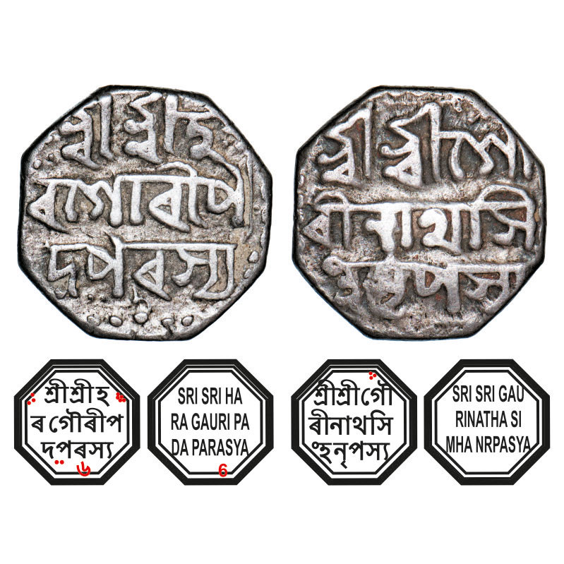| Assam, Octagonal Silver Half Rupee, 5.66g, Gaurinatha Simha (1780-95), Assamese legends in three lines, year 6, with invocation to Siva & Parvati, Obv: Sri Sri Ha/ra Gauri Pa/da Parasya, & (year) 6 at bottom, Rev: Sri Sri Gau/rinatha Si/mha Nrpasya. rare type with year on obverse. Reverse die perfectly struck at 6 o'clock. (A.Mitra. 383A unlisted. RB. R 69 unlisted). Very Fine+, Rare. |
