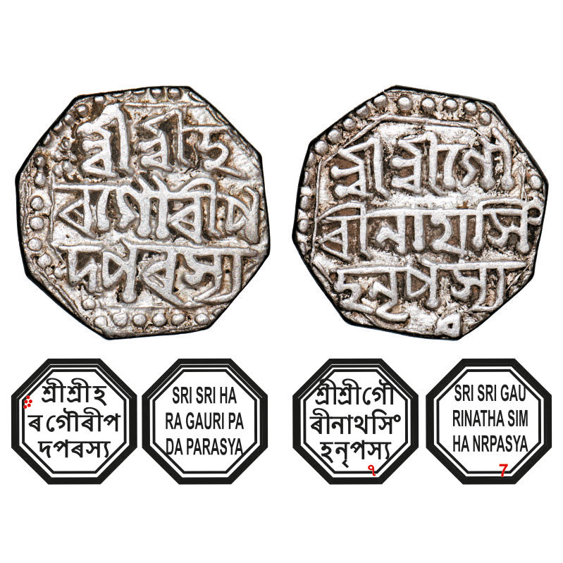 | Assam, Octagonal Silver Half Rupee, 5.56g, Gaurinatha Simha (1780-95), Assamese legends in three lines, year 7, with invocation to Siva & Parvati, Obv: Sri Sri Ha/ra Gauri Pa/da Parasya, Rev: Sri Sri Gau/rinatha Sim/ha Nrpasya & (year) 7 at bottom. Reverse die perfectly struck at 6 o'clock. (A.Mitra. 384. RB. R 70 unlisted type). Very Fine+, Scarce. |
