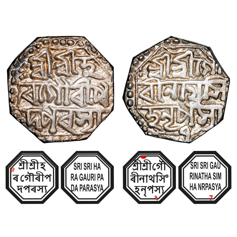 | Assam, Octagonal Silver Half Rupee, 5.64g, Gaurinatha Simha (1780-95), Assamese legends in three lines, year 7, with invocation to Siva & Parvati, Obv: Sri Sri Ha/ra Gauri Pa/da Parasya, Rev: Sri Sri Gau/rinatha Sim/ha Nrpasya & (year) 7 at bottom, with crescent on top. Reverse die perfectly struck at 6 o'clock. (A.Mitra. 384A. RB. R 70.2 type). Very Fine+, Scarce. |