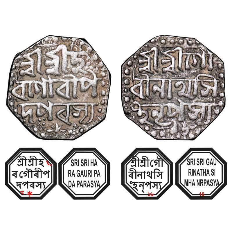 | Assam, Octagonal Silver Half Rupee, 5.60g, Gaurinatha Simha (1780-95), Assamese legends in three lines, year 16, with invocation to Siva & Parvati, Obv: Sri Sri Ha/ra Gauri Pa/da Parasya, sunburst below, Rev: Sri Sri Gau/rinatha Si/mha Nrpasya & (year) 16 at bottom. Reverse die perfectly struck at 6 o'clock. (A.Mitra. 390B. RB. R 76.5 type). Very Fine, Scarce. |