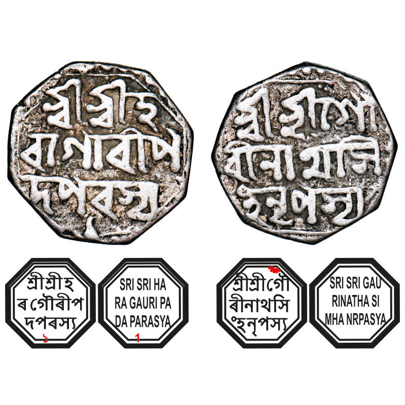 | Assam, Octagonal Silver Half Rupee, 5.64g, Gaurinatha Simha (1780-95), Assamese legends in three lines, year 1(year of reinstalation of the king), with invocation to Siva & Parvati, Obv: Sri Sri Ha/ra Gauri Pa/da Parasya, (year) 1 below, Rev: Sri Sri Gau/rinatha Si/mha Nrpasya. Reverse die perfectly struck at 6 o'clock. (A.Mitra. 392. RB. R 77.1 type unlisted). Very Fine, Scarce. |