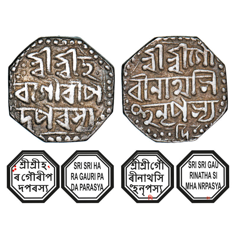 | Assam, Octagonal Silver Half Rupee, 5.72g, Gaurinatha Simha (1780-95), Assamese legends in three lines, year 'Di', with invocation to Siva & Parvati, Obv: Sri Sri Ha/ra Gauri Pa/da Parasya, Rev: Sri Sri Gau/rinatha Si/mha Nrpasya & 'Di' below (Dichoi mint). Reverse die perfectly struck at 6 o'clock. (A.Mitra. 392. RB. R 77.2 type unlisted). Very Fine, Scarce. |