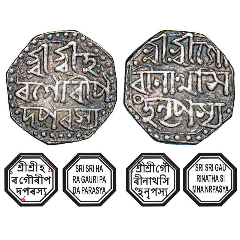 | Assam, Octagonal Silver Half Rupee, 5.74g, Gaurinatha Simha (1780-95), Assamese legends in three lines, undated, with invocation to Siva & Parvati, Obv: Sri Sri Ha/ra Gauri Pa/da Parasya, Rev: Sri Sri Gau/rinatha Si/mha Nrpasya. Reverse die perfectly struck at 6 o'clock. (A.Mitra. 378H, RB. R 87 type unlisted). Toned About Very Fine, Scarce. |