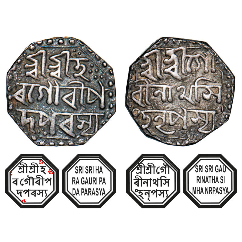 | Assam, Octagonal Silver Half Rupee, 5.66g, Gaurinatha Simha (1780-95), Assamese legends in three lines, undated, with invocation to Siva & Parvati, Obv: Sri Sri Ha/ra Gauri Pa/da Parasya, Rev: Sri Sri Gau/rinatha Si/mha Nrpasya. Reverse die perfectly struck at 6 o'clock. (A.Mitra. 378I, RB. R 87 type unlisted). Toned About Very Fine, Scarce. |