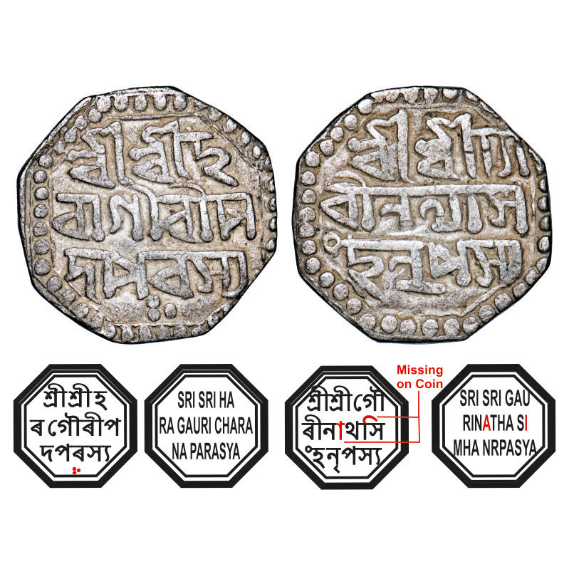 | Assam, Octagonal Silver Quarter Rupee, 3.05g, Gaurinatha Simha (1780-95), Assamese legends in three lines, (struck with half rupee die, may be later country made), with invocation to Siva & Parvati, Obv: Sri Sri Ha/ra Gauri Pa/da Parasya, Rev: Sri Sri Gau/rinatha Si/mha Nrpasya. Reverse die perfectly struck at 6 o'clock. (A.Mitra. 399. RB. R unlisted). Very Fine, Rare. |