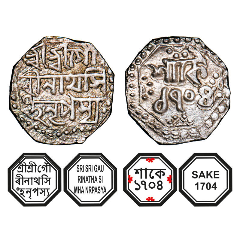| Assam, Octagonal Silver Quarter Rupee, 2.85g, Gaurinatha Simha (1780-95), Sk. 1704, Assamese legends in three lines, Obv: Sri Sri Gau/rinatha Si/mha Nrpasya, Rev: in two lines, Sake 1704. Reverse die perfectly struck at 6 o'clock. (A.Mitra. 401. RB. R92.1). About Extremely Fine, Scarce. |