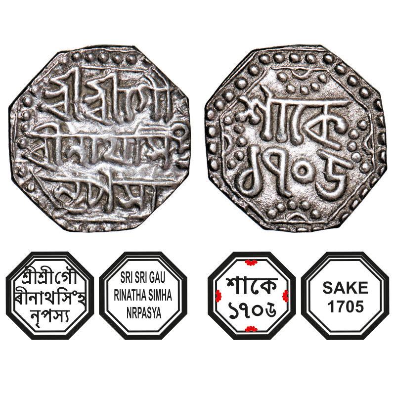 | Assam, Octagonal Silver Quarter Rupee, 2.88g, Gaurinatha Simha (1780-95), Sk. 1705, Assamese legends in three lines, Obv: Sri Sri Gau/rinatha Simha/ Nrpasya, Rev: in two lines, Sake 1705, Reverse die perfectly struck at 6 o'clock. (A.Mitra. 403. RB. R93.1). Broad flan, Extremely Fine, Scarce. |