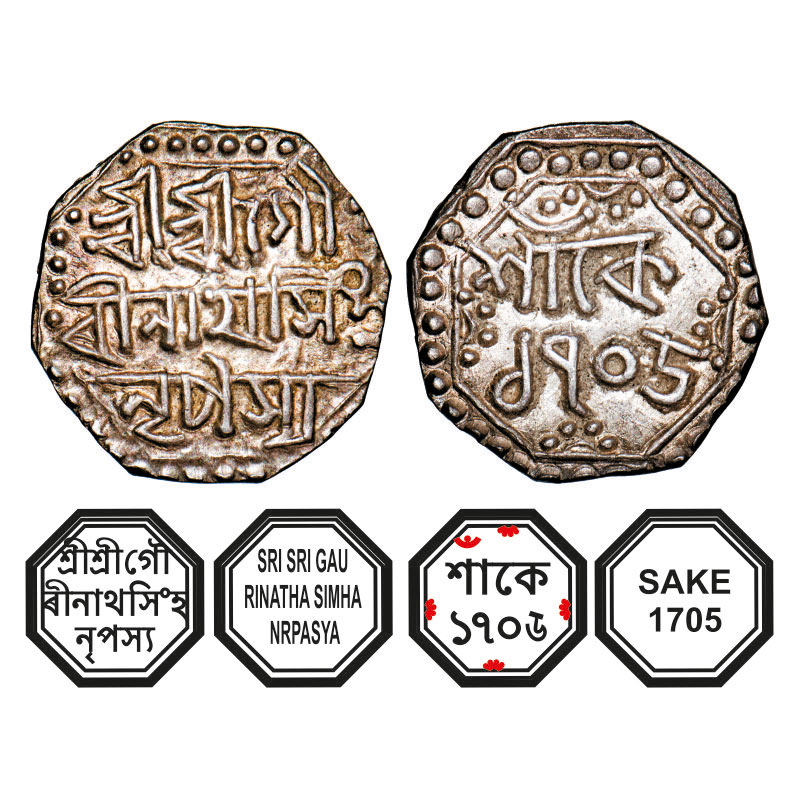 | Assam, Octagonal Silver Quarter Rupee, 2.82g, Gaurinatha Simha (1780-95), Sk. 1705, Assamese legends in three lines, Obv: Sri Sri Gau/rinatha Simha/ Nrpasya, Rev: in two lines, Sake 1705, crescent on top left, Reverse die perfectly struck at 6 o'clock. (A.Mitra. 403. RB. R93.2). Broad flan, Mint State, Scarce. |