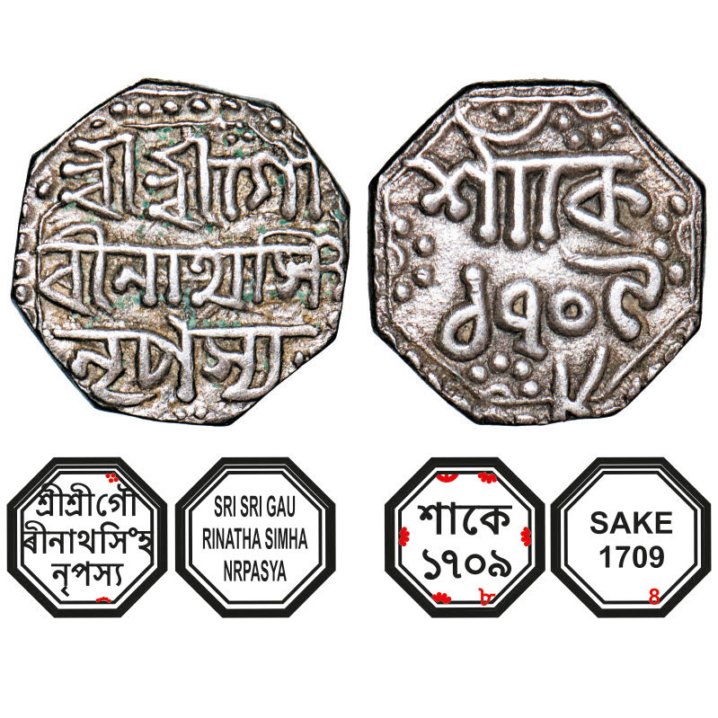 | Assam, Octagonal Silver Quarter Rupee, 2.88g, Gaurinatha Simha (1780-95), Sk. 1709 year 8, Assamese legends in three lines, Obv: Sri Sri Gau/rinatha Simha/ Nrpasya, Rev: in two lines, Sake 1709 / 8, with crescent on top left. Reverse die perfectly struck at 6 o'clock. (A.Mitra. 409. RB. R102.1). Very Fine+, Scarce. |