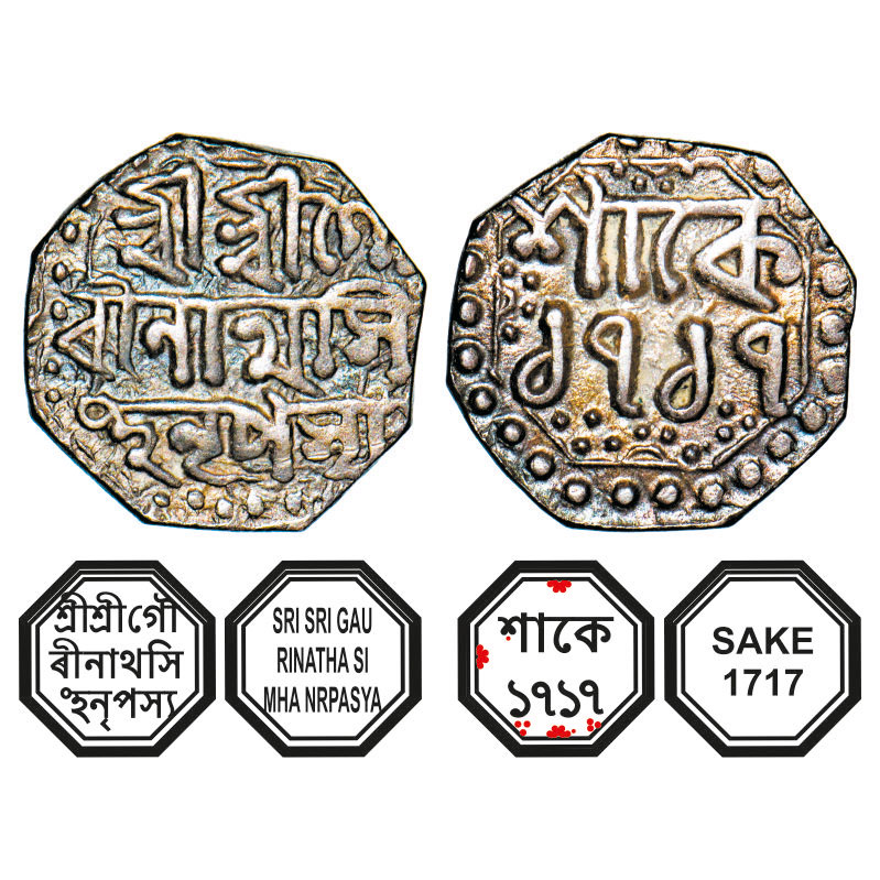 | Assam, Octagonal Silver Quarter Rupee, 2.83g, Gaurinatha Simha (1780-95), Sk. 1717, Assamese legends in three lines, Obv: Sri Sri Gau/rinatha Si/mha Nrpasya, Rev: in two lines, Sake 1717. Reverse die perfectly struck at 6 o'clock. (A.Mitra. 423. RB. R116.2). Toned Extremely Fine+, Scarce. |