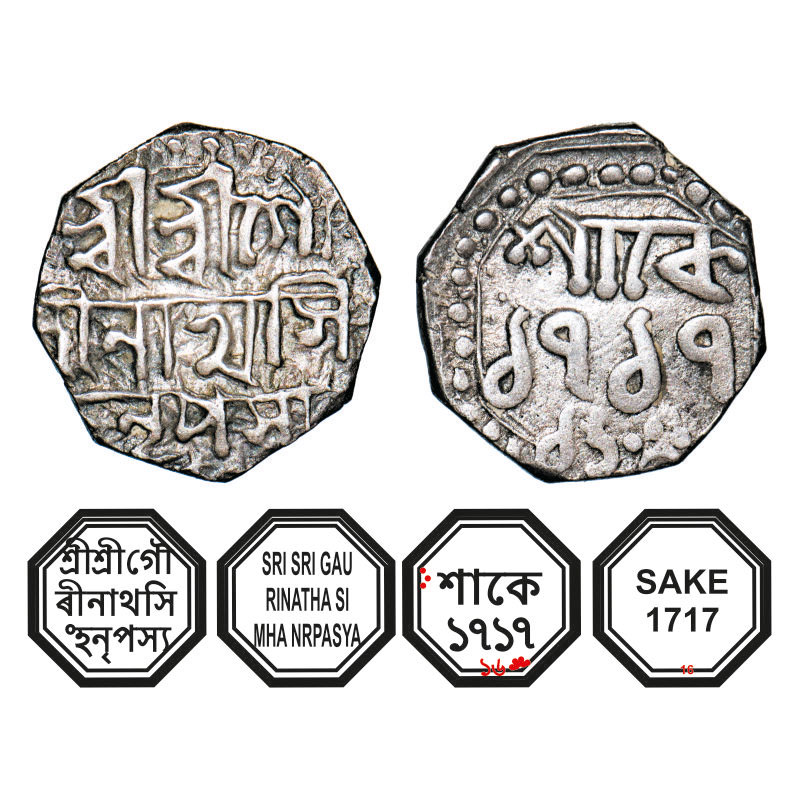 | Assam, Octagonal Silver Quarter Rupee, 2.83g, Gaurinatha Simha (1780-95), Sk. 1717 year 16, Assamese legends in three lines, Obv: Sri Sri Gau/rinatha Si/mha Nrpasya, Rev: in two lines, Sake 1717 / 16. Reverse die perfectly struck at 6 o'clock. (A.Mitra. 424. RB. R118.3). Toned Very Fine, Scarce. |