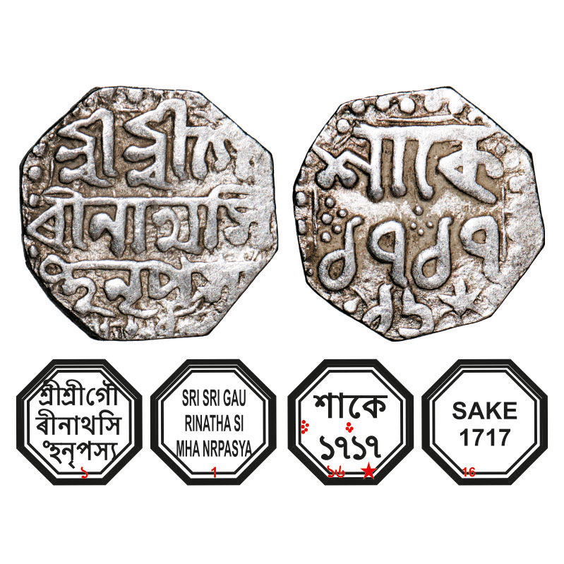 | Assam, Octagonal Silver Quarter Rupee, 2.83g, Gaurinatha Simha (1780-95), Sk. year 1 on obverse & 1717 year 16 on reverse, Assamese legends in three lines, Obv: Sri Sri Gau/rinatha Si/mha Nrpasya (year) 1, Rev: in two lines, Sake 1717 / 16 & star. Reverse die perfectly struck at 6 o'clock. (A.Mitra. 425. RB. R122.1). About Very Fine, Scarce. |