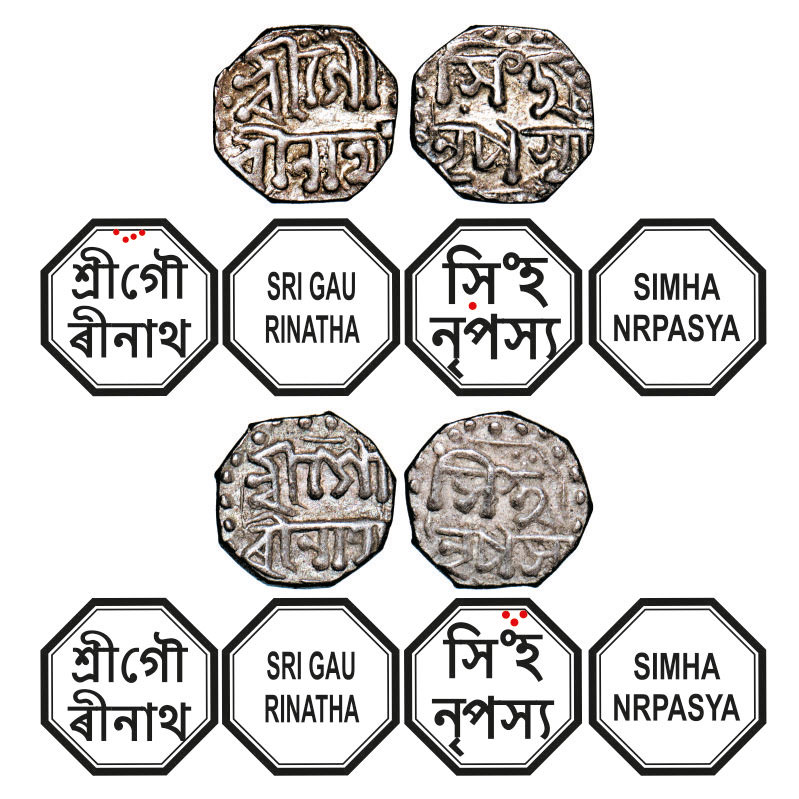 | Assam, Octagonal Silver 1/16 Rupee (2 Coins), 0.68g, Gaurinatha Simha (1780-95), undated, Assamese legends in two lines, Obv: Sri Sri Gau/rinatha, Rev: Simha/ Nrpasya. Reverse die perfectly struck at 6 o'clock. (A.Mitra 432 types. RB. R128 types). Very Fine+, Very Scarce. |