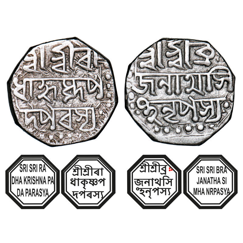 | Assam, Octagonal Silver Half Rupee, 5.63g, Brajnatha Simha (1817/18-1819), undated, Assamese legends in three lines, with invocation to Radha and Krishna, Obv: Sri Sri Ra/dha Krishna Pa/da Parasya, Rev: Sri Sri Bra/janatha Si/mha Nrpasya. Reverse die perfectly struck at 6 o'clock. (A.Mitra. 451, RB. T 10.1 type unlisted). Very Fine, Very Rare. |
