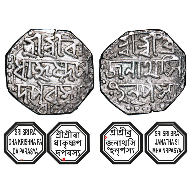 | Assam, Octagonal Silver Half Rupee, 5.18g, Brajnatha Simha (1817/18-1819), undated, Assamese legends in three lines, with invocation to Radha and Krishna, Obv: Sri Sri Ra/dha Krishna Pa/da Parasya, 'Ra' below (Rangpur), Rev: Sri Sri Bra/janatha Si/mha Nrpasya. Reverse die perfectly struck at 6 o'clock. (A.Mitra. 452, RB. T 11.1 type). Very Fine, Very Rare. |