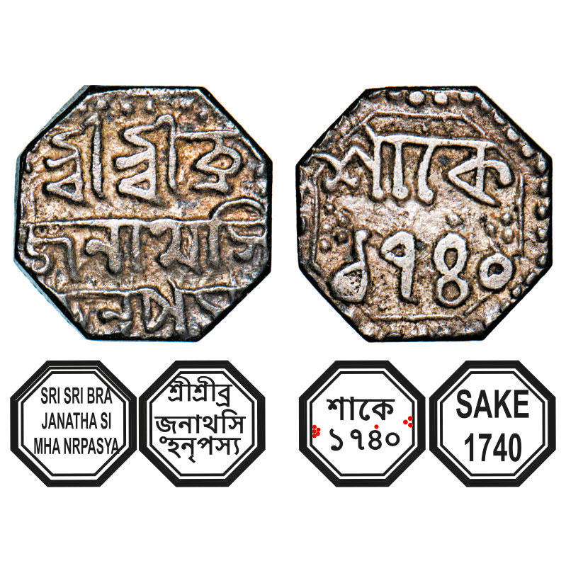 | Assam, Octagonal Silver Quarter Rupee, 3.00g, Brajnatha Simha (1817/18-1819), Sk. 1740, Assamese legends in three lines, Obv: Sri Sri Bra/janatha Si/mha Nrpasya, Rev: in two lines, Sake 1740. Reverse die perfectly struck at 6 o'clock. (A.Mitra. 454, RB. T 13.2 type). Toned Extremely Fine, Very Rare. |