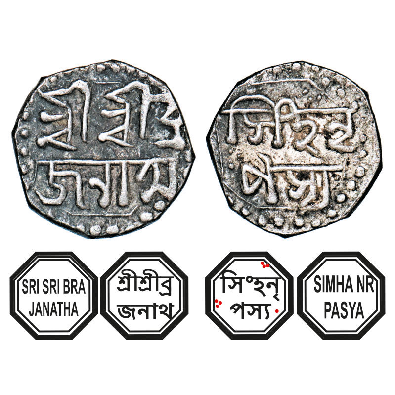 | Assam, Octagonal Silver 1/8 Rupee, 1.41g, Brajnatha Simha (1817/18-1819), undated, Assamese legends in two lines, Obv: Sri Sri Bra/janatha, Rev: Simha Nr/pasya. Reverse die perfectly struck at 6 o'clock. (A.Mitra. 456, RB. T 14.1 type). Toned Extremely Fine, Rare. |